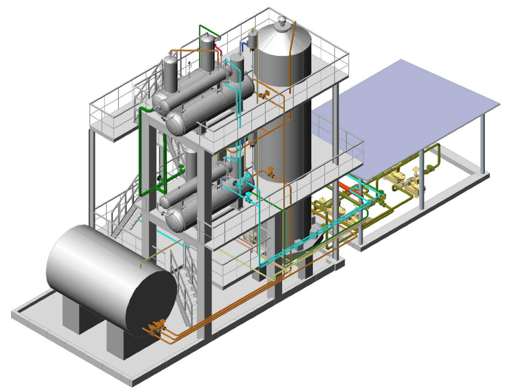 Оборудование (теплообменные аппараты, окислительные емкости, насосы) размещается под и на технологической этажерке, состоящей из 3-х уровней. Технологическая этажерка по правилам и нормам ПБ проектируется как железобетонная конструкция.